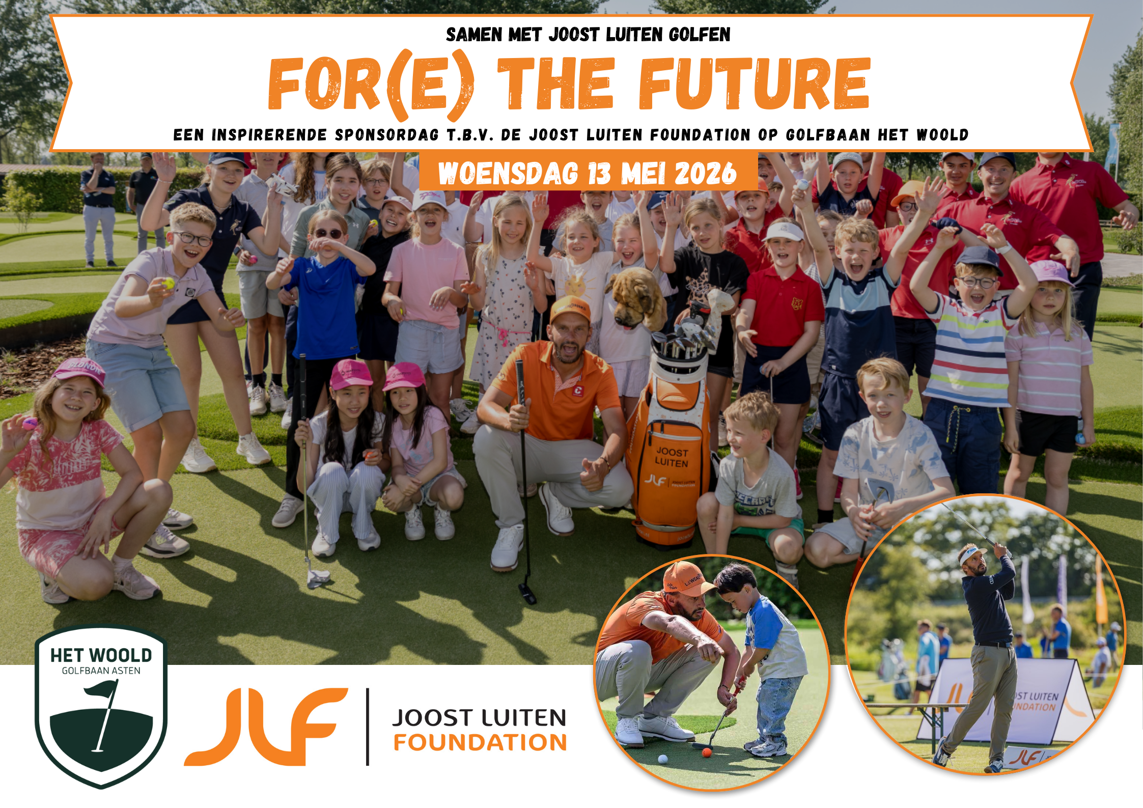 For(e) the Future is een exclusieve sponsordag en tijdens deze inspirerende dag combineren we onze gezamenlijke passie voor de golfsport en maatschappelijke impact, want één doel staat centraal: de volgende generatie kennis laten maken met de golfsport. De Joost Luiten Foundation zet zich in om kinderen en jongeren de kans te geven golf te ontdekken, plezier te beleven aan bewegen en hun talent te ontwikkelen. Door drempels weg te nemen en projecten te ondersteunen die golf toegankelijk maken voor jeugd, wil de foundation bijdragen aan een sportieve en inspirerende toekomst. Zo ook de projecten die op Golfbaan het Woold plaatsvinden.