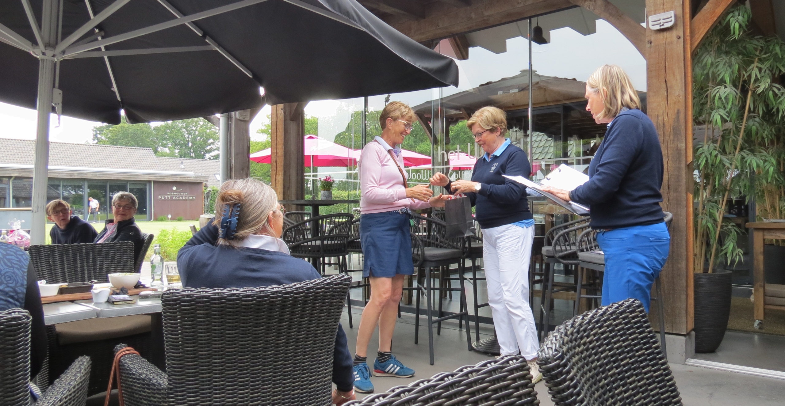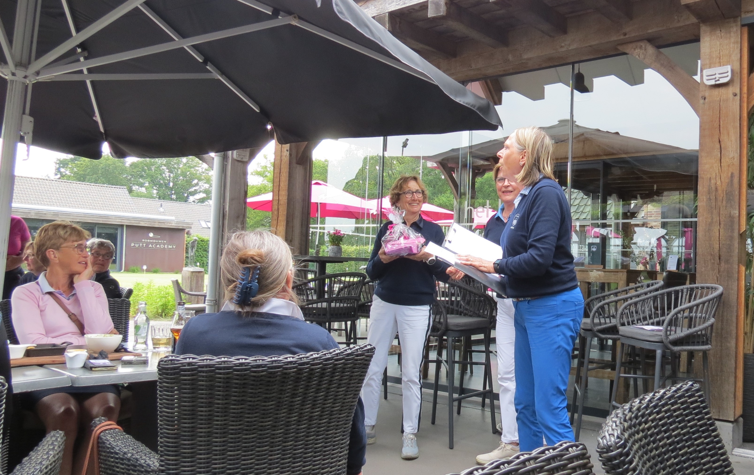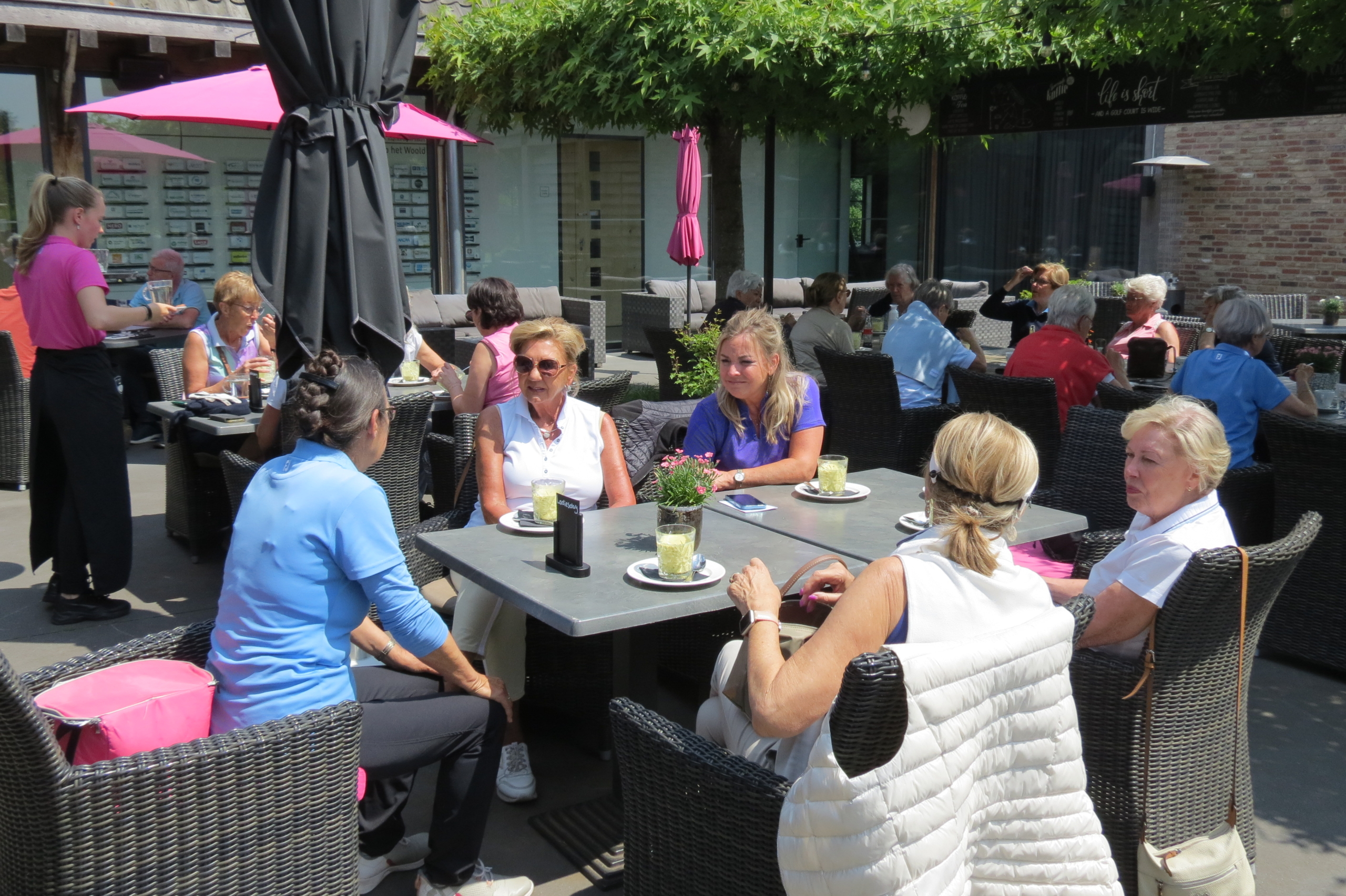 Tussen de twee rondes werd er een heerlijke lunch op het terras geserveerd: soep en belegde broodjes en friandises, uiteraard onder het genot van een drankje. De dames lieten het zich goed smaken.